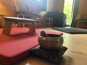 Salle en bois cosy chauffée réalisée selon les règles feng shui et Geobiologie et avec tout le matériel (sans perturbateurs endocriniens !) disponible sur place.